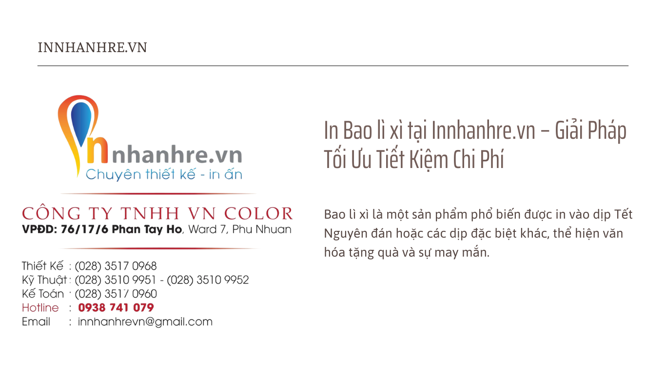Bao lì xì là một phần không thể thiếu trong văn hóa Tết và các dịp lễ quan trọng, đặc biệt là ở các nước châu Á như Việt Nam. Bao lì xì là phong bao đỏ dùng để đựng tiền may mắn và trao tặng cho người khác, mang nhiều ý nghĩa tốt đẹp và sâu sắc về sự may mắn, hạnh phúc, và tình thân. Vì vậy, Innhanhre.vn cam kết mang đến dịch vụ chất lượng với các tiêu chí sau: