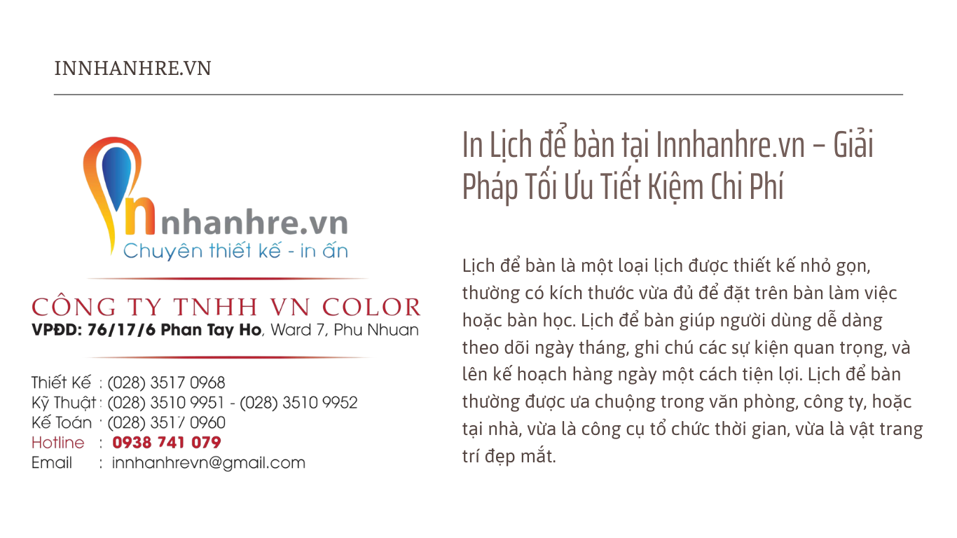 Bạn đang muốn tìm một địa chỉ tin cậy để in lịch treo hoặc lịch để bàn chất lượng tại TP.Hồ Chí Minh? Hãy khám phá dịch vụ in của chúng tôi tại CÔNG TY TNHH VN COLOR! Chúng tôi cam kết mang đến cho bạn những sản phẩm lịch đẹp mắt, chất lượng và tiện lợi.